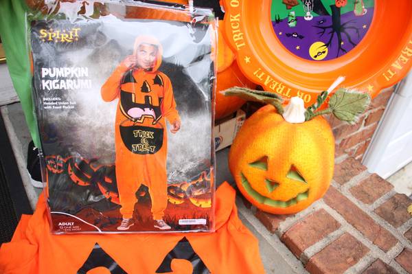 Pumpkin Kigarumi Costume NEW in package and never opened. Cozy and comfortable orange once piece jumpsuit with large Treat or Treat front pouch in front. Great costume that is a great option to keep you feeling warm on any cold or windy night. Long sleeves zipper closure. Material in Polyester Care which is Machine wash. One size fits most. Bought for $44.99 but went with another costume and never used. Will sell for $35.00 or BO. Easy Porch pick up or Will ship for additional cost or agree to delivery at add’l charge by seller. CASH or PAYPAL ONLY