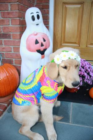 “Bootique” adorable 2 Piece 70’s Tie dye Pet Costume for either a cat or dog. This colorful tie-dye design is perfect for any spooky/Hippie type celebration party or a stand out for Halloween. Comes with stretchy tie dye looking shirt with peace sign and Felt daisy stretchable/adjustable headband Has opening for collar loop to go through for attaching a leash. Size Large.