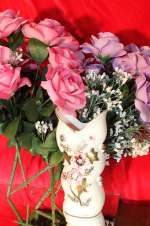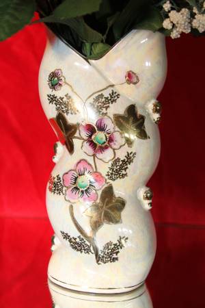 Very Unique Mother of Pearl design with colorful flowers and gold accents. Vase from Japan which sits 8 inch tall with wide open mouth. 6 stems of purple and pink flowers and baby breaths. Add this decorate piece to any room in your house. Will sell for $25.00 or BO