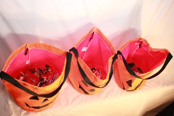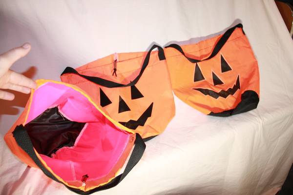 I have 3 of these colorful Pumpkin face trick or treat bags that holds lots of candy etc. Has drawstring at the top to hold in all your trick or treat goodies. Strong fabric that is water proof and easy to clean with orange pumpkin face on outside and bright pink on the inside. Long Black strong handle. Ideal size of 14” Wide and 15” deep. Will sell individually for $2.50 each bag or take all 3 for $6.00. Easy Porch pick up or Will ship for additional cost or agree to delivery at add’l charge by seller. CASH or PAYPAL ONLY
