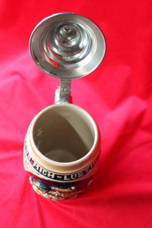 Bought directly from a German Store while on vacation. 9 Inches Beer Stein -Stoneware, hand painted raised relief decoration, an antiqued conical pewter lid completes the piece. beautifully detailed traditional scene. Limited Edition
