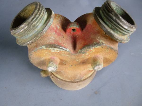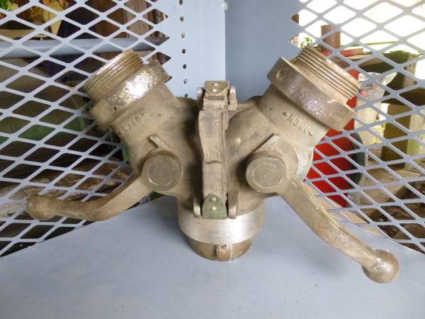 Very heavy vintage Akron Brass Y splitter valve. I machined and threaded a stainless steel adapter to fit a NST 2-1/2" Female inlet fitting off of an old hose about 38 years ago thinking I could use this on a fire truck I had at the time, but never did. One handle is bent. The end plugs were brazed in place for some unknown reason. The ball valves seem lose and probably would not seal that well. Also I have a smaller Y splitter ball valve with broken handles shown in the later pictures, priced at $40.