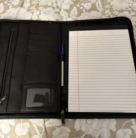 Rutgers Business School MBA program, embossed on front, zippered all around portfolio, multiple pockets for keeping supplies organized, enough room for an e reader or tablet, accommodates an 8 1/2" x 11"sized pad for note taking. It's 9" x 13". I've left my used pad in, but can easily be replaced, excellent condition.
