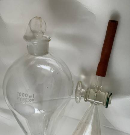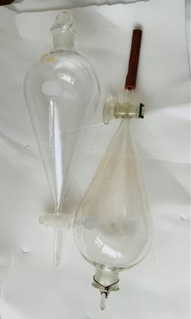 two vintage chemistry glas separatory funnels - one is Pyrex No. 6400, 1000ml and the other is Kimax 1000ml. Good vintage used condition. Pick up only.