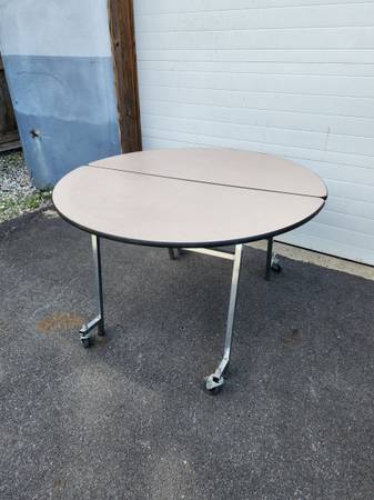 Sico 48" Round Mobile Cafeteria Banquet Pacer Folding Table, Laminated top and chrome metal frame. Several available $75 OBO each, all are in good/fair condition with light and heavy scratches and dusty, School system Surplus inventory.