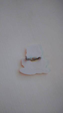 As with most plastic pins, this one has an old-style clasp on the back, with glue visible (as is normal for that era).