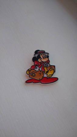 This is a Great plastic pin features a very happy Mickey Mouse, facing right, running with a pair of suitcases. He is dressed in 1940s or 1950s outfit with red jacket and tie, yellow pants and shoes and a white straw hat with red band. He wears a button on his coat that says "HI!" and the suitcases are brown.