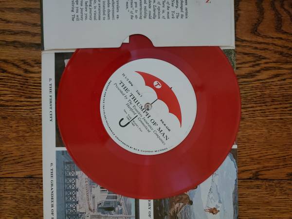 Great keepsake from the 1964 World's Fair!A red 33/13 rpm single record with a recording by The Hartford Symphony Orchestra. Including a fold out sleeve with 12 stages of the triumph of man: 1) The dawn of man. 2) The discovery of fire. 3) The origin of art. 4) The beginning of Agriculture. 5) The first city. Etc. ; 12mo 7" - 7½" tall.