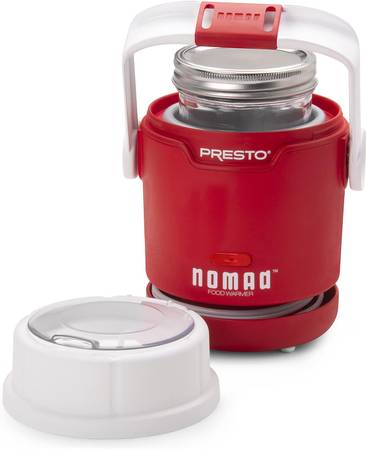 The easy way to transport prepared food to most anywhere and heat it once you arrive. The Presto® Nomad® traveling food warmer conveniently heats soups, leftovers, and more in the included Mason jar so you can enjoy hot, flavorful lunches at work, school, or home. It also works on-the-go in vehicles with an AC power source. Nomad® gently heats food serving hot in about two hours. Just remove the cover and eat right out of the jar. Prepare lunches for the week in wide-mouth, pint-size Mason jars. Each day before leaving home, place a jar in the food warmer. When you arrive, plug in warmer. The carry handle features a utensil storage band that holds a spoon, fork or both assuring complete portability (utensils not included). Transport crackers or condiment packets in the snap-open cover storage. The twist-on cover seals tight to prevent spills in your bag or car during commute, and the swing-up carry handle and built-in cord-wrap make it easy to transport. The food warmer fits a wide-mouth, pint-size Mason jar (one jar included). Jar is removable and dishwasher safe.