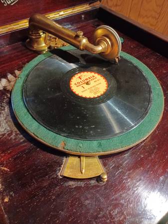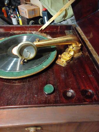 Popup top to turn table. Has a single cabinet door that needs a few hardware pieces replaced. (door needs 1 knob & 2 hinges). Inside of storage area has seven shelves for holding sheet music or records. Cabinet is very solid and has some nicks and scuffs but almost all of the cabinet has been re-finished. Phonograph works but doesn't spin very long. Seems a little weak. Great restoration project. It comes with about 20 - 78 RPM records