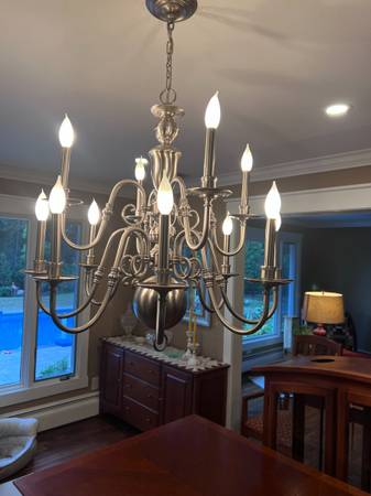 Pewter chandelier looking for a new home. Perfect clean condition. Non-smoking home. Height from the top ring (not including the chain) to the bottom of the ring is 26” and it’s 28” in diameter....