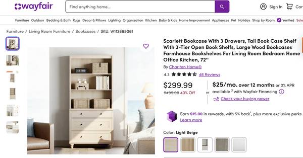 Selling a brand-new Scarlett Bookcase from Wayfair – we missed the return window, so our loss is your gain! ✨ Key Features: Retail Price: $299 (selling for $160 – save $139!) Color: Light Beige...