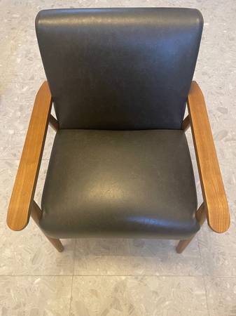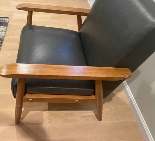 The perfect vintage-look piece to complete your mid-century modern decor, this attractive wood-framed chair has it all: style, comfort, and durability. Created with plush foam cushioning that encourages you to settle in and relax, it features a unique open-framed arm design, complete with rounded wooden accent bolt covers for an authentic retro finish. Comfortably padded seat and back cushions are finished in rich faux leather for an elegant finishing touch.