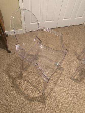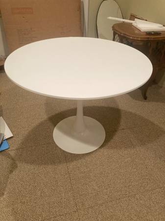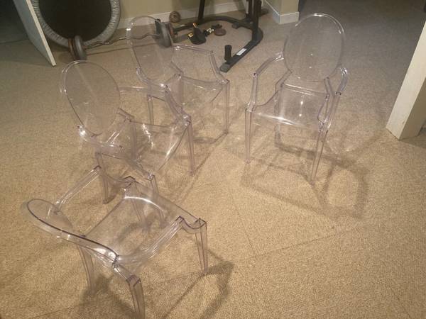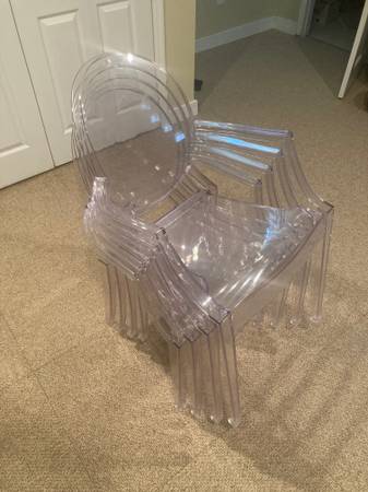 Brand new white round table with four (4) Acrylic Chairs. Table top is brand new replacement for a damaged one. Chairs are in excellent condition and VERY sturdy and very comfortable to sit. Chairs are stackable for easy storage. Table top can easily be removed for easy storage with four bolts.