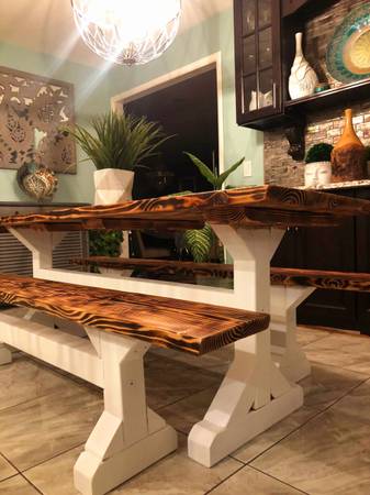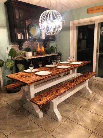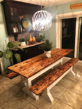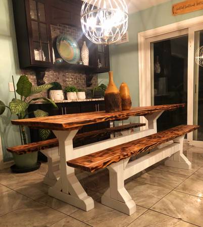 GORGEOUS FARMHOUSE CUSTOM SOLID WOOD DINING SET, STUNNING AND UNIQUE SET THAT IT IS A SPACE-SAVING OPTION. BENCHES HIDE INSIDE DINING TABLE.