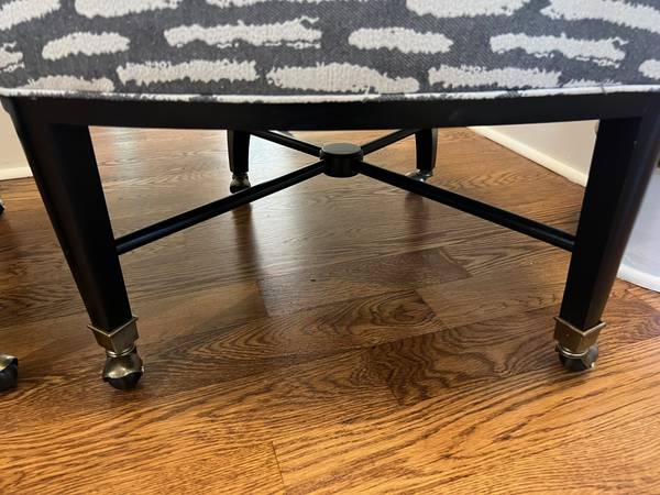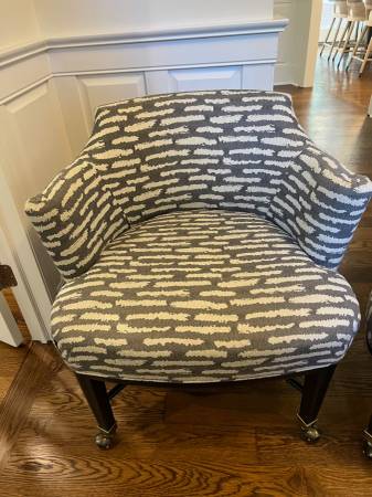 The "Vanguard Audrey Game Chair" is an upholstered accent chair on casters, designed by Vanguard Furniture for living or dining room use. It's an upholstered accent chair with wheels, perfect for adding comfortable seating to a living or dining area, because of the wheels the chair can be used as a desk chair for easy movement.