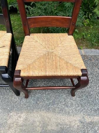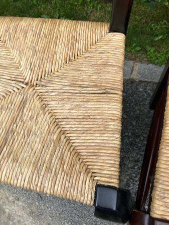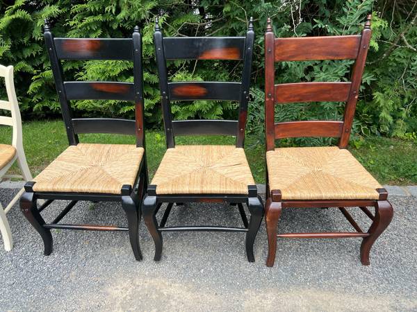 Set of 3 Wood and Rush Seat Chairs—Great Condition slight color variation 44”h x 22”w @ legs x 20”w @ seat 17” sd x 18”sh Smoke free household