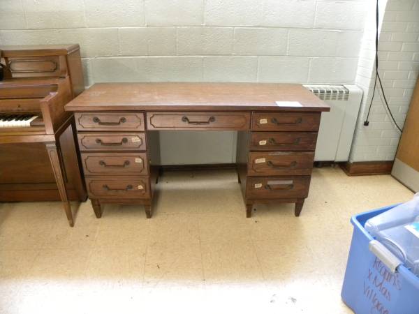 THIS IS AN OLDER DESK. IT WAS DONATED TO MY CHURCH. IT HAS WOODEN DOOR BOTTOMS. IT HAS LOTS OF DRAWERS. IT IS NOT VERU HEAVY. I WOULD LIKE TO SELL IT FOR $50.00. CALL TO SEE IT.