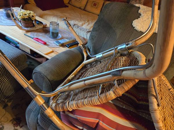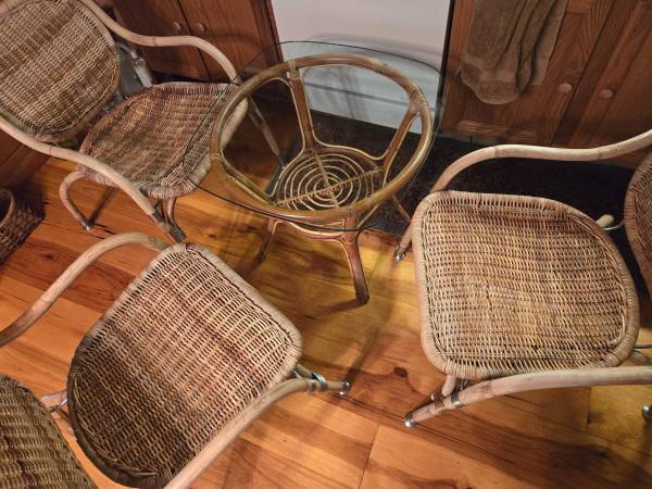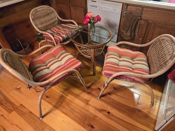 We have for sale uniq set,rattan chairs by designer MATS THESELIUS-3 PC,plus cushions and coctail table.Chairs are comfortable,no damage on rattan and have replacament with stainless ties,where was mising stainless wire.Chairs only seling online for high price.You can see.Please see pictures for details.OBO.