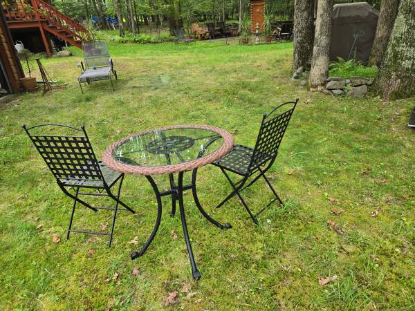 Outdoor table and 2 folding chairs- wrought iron.Very strong.New refinish.Table-diameter 30,5",tall-28".Glass top and plastick wicker around.OBO.