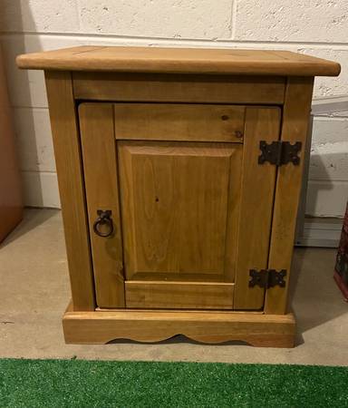 Solid, sturdily built wooden nightstand table, asking $50. 21”h x 19.5”w x 19.5”d Lamp not included.