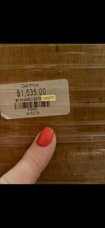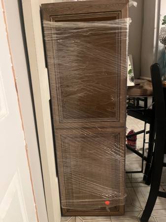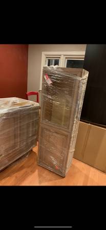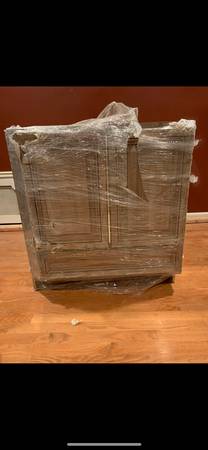 So, I bought the wrong size. 2 absolutely beautiful wood pieces. New still have plastic wrap. Although has some minor scratches from being moved to storage. Only opened to take photos. Vanity has 2 doors and a bottom drawer. Left side finished. Measures 33x22x35D The "Tower" has an upper open display and storage on bottom. 55H x 17 1/2 W x 13D Color listed as multi but its more of a grayish/ stonewashed (with brown tone’s (maybe black) piping Need it gone soon !
