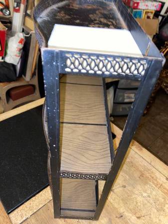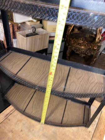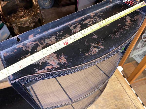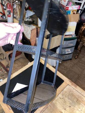 This is super lightweight I believe made of tin or thin metal old vintage 3 tier wall shelf. Hangs up very easy and don’t need anchors to fold this up. I believe it’s from 50-60s era and has a natural worn look and can go in any room. Has a wood like sticker on floor of two bottom shelfs the top is just metal which easy to paint or put anything theee in place I put white board to show how easy to cover if you cut and fit something there. It’s top shelf so prob will not see in there anyway hung up. Email or text