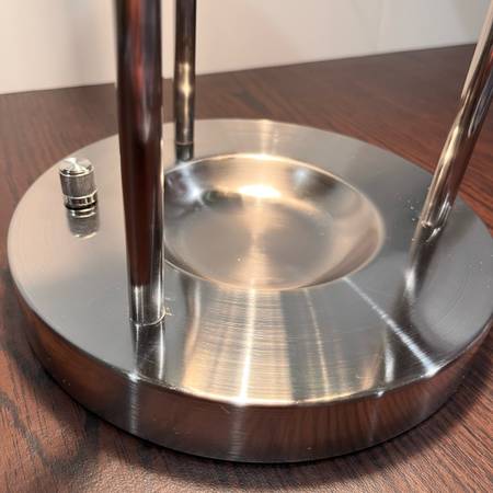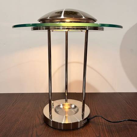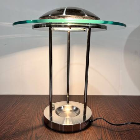 A beautiful chrome and glass Saturn Lamp. A post modern 90’s replica of the classic Robert Sonneman Saturn Lamp. Perfect condition. Closet Stored for 20 years. No wear or signs of use whatsoever. Adjustable switch allows for low light, high light or anything in between. Internal diffuser softens the halogen light. Perfect for the office or home. Plays well in any modern or MCM environment. Chrome is clean, glass is perfect. Measures 18”h x 16”w.