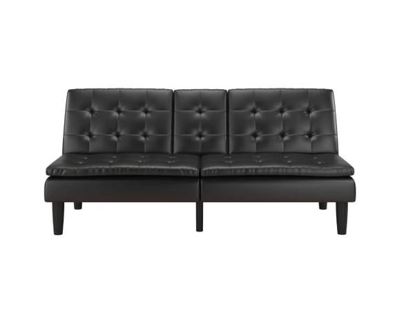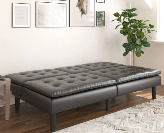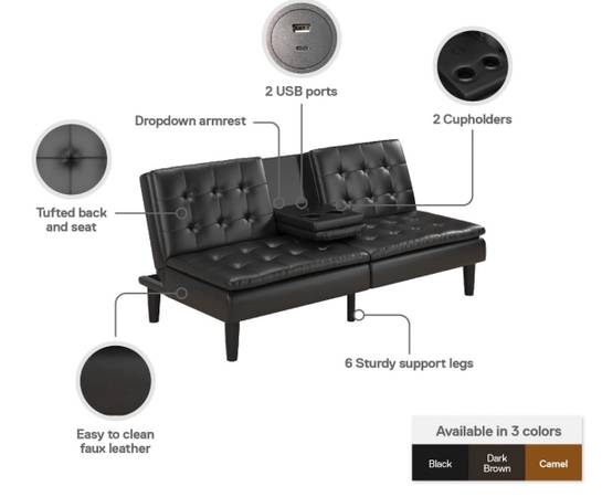 Black sofa bed upholstered in faux leather. Great condition. Memory foam. Cup holder. Multifunctional piece!