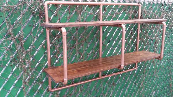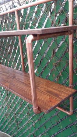 Made of 3/4 copper tubing and reclaimed wood shelves. Comes with screws and clips ready for hanging. Can also be made to your specifications and copper can be painted any color you like. Each copper joint has been soddered. Shipping and delivery available for a fee.