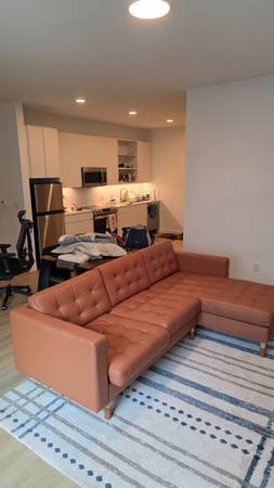 lightly used sofa/chaise, no scratches, blemishes or smell. like new
