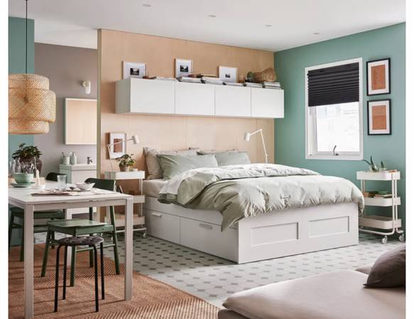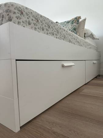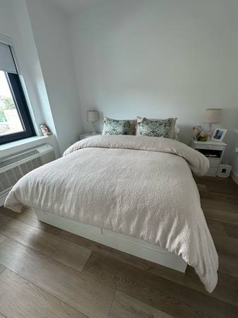 BRIMNES Bed Frame with Storage – Queen Size (White) ✨ Like new, gently used! 🛏️ Perfect for saving space with 4 roomy storage drawers. Sturdy, modern, and stylish IKEA design. 2 White Nightstand...