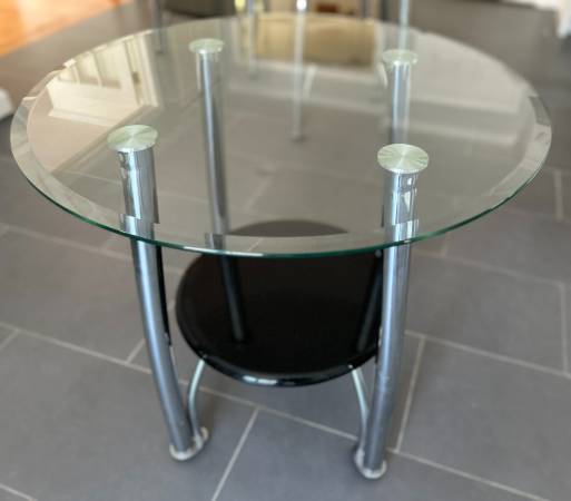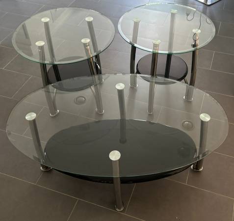 Oval glass coffee table and round glass side table in great condition. Height of each leg can be slightly adjusted to account for uneven floors if needed. Purchase comes with free 2nd side table whose base is separated from the glass top as shown in photo.