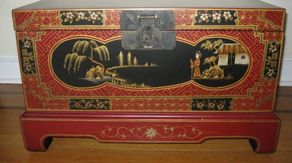 Medium rectangular red chest with fascinating chinoiserie images and handles for easier mobility. It is in good condition. Exterior dimensions of approximately 26" long X 18¾" deep X 15" high. Interior dimensions of approximately 23¾" long X 16½" deep X 10½" high.