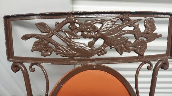 4 Wrought-iron chairs upholstered with a orange/red simulated leather fabric.