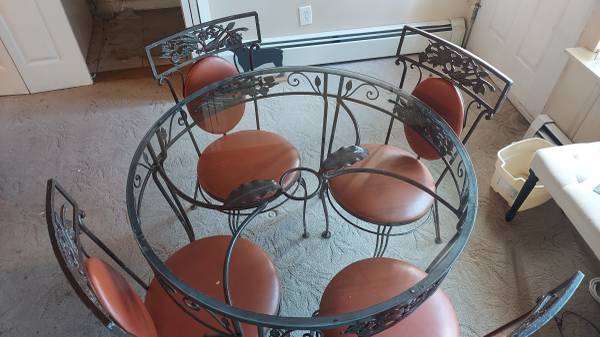 The Wrought-iron table frame, and the chair frames are painted with a glossy brown enamel.