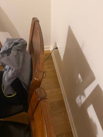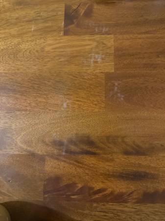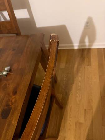 Some wear on tops of chairs and some marks on the table itself but very sturdy! Black leather cushions on chairs, some chairs may need tightening