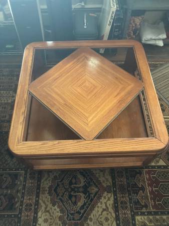 1 end table missing glass. Coffee table 37”Lx37”Wx15 1/2” H. 2-end pieces 28”Lx33”Wx22”H. At least 40 plus years old