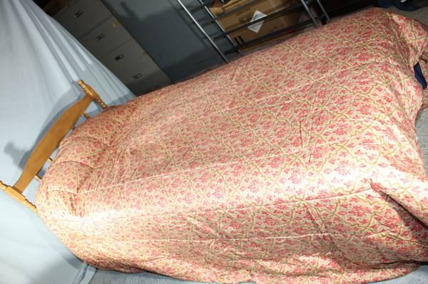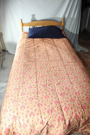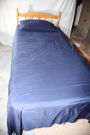 Twin Extra Long length 80” Long (5” longer than a regular twin) x 38” Wide x 24” High. Foam Mattress and Box Spring. Sits on a heavy duty with wide wheels and back brakes steel frame. Includes all wood maple spindle headboard. Also Includes Sheet Set, Pillow and case and Quilt Bedspread. No rips or tears. Smoke, pet free home. Will sell everything as a set for $125.00 or BO. WILL NOT SHIP. MUST PICK UP ITEM. or agree to delivery at add’l charge by seller CASH, Zelle or PayPal Only.