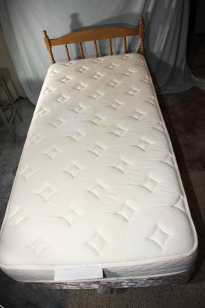 Twin Extra Long length 80” Long (5” longer than a regular twin) x 38” Wide x 24” High. Foam Mattress and Box Spring. Sits on a heavy duty with wide wheels and back brakes steel frame. Includes all wood maple spindle headboard. Also Includes Sheet Set, Pillow and case and Quilt Bedspread. No rips or tears. Smoke, pet free home. Will sell everything as a set for $125.00 or BO. WILL NOT SHIP. MUST PICK UP ITEM. or agree to delivery at add’l charge by seller CASH, Zelle or PayPal Only.