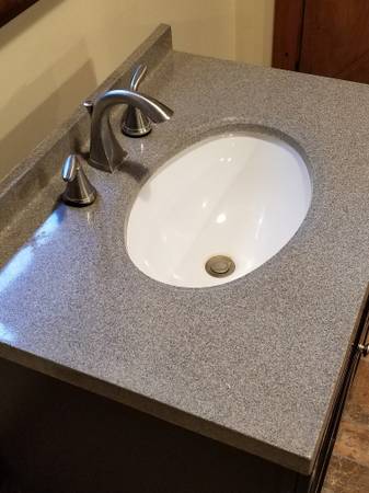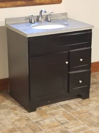 30 inch wide vanity with gloss black finish, molded gray solid surface top with backsplash, and white undermount sink. Needs new faucet.