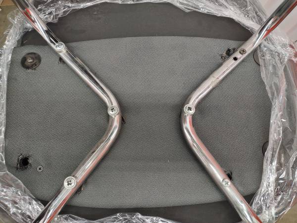 Chairs are solid. Some have missing screws and some imperfections on the underside of the chairs as shown in the pictures. All glides are present. No tag. No tears, rips, or snags to the upholstery.