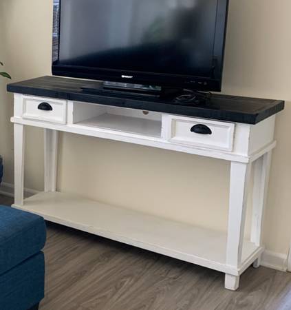 Distressed wood Buffet/TV table with two drawers. Whitewash base, black wash top.