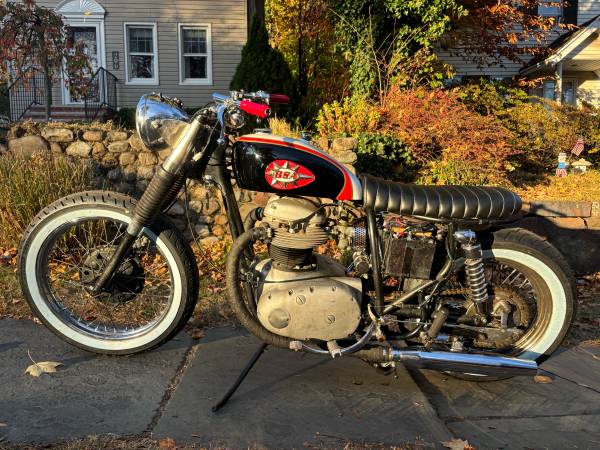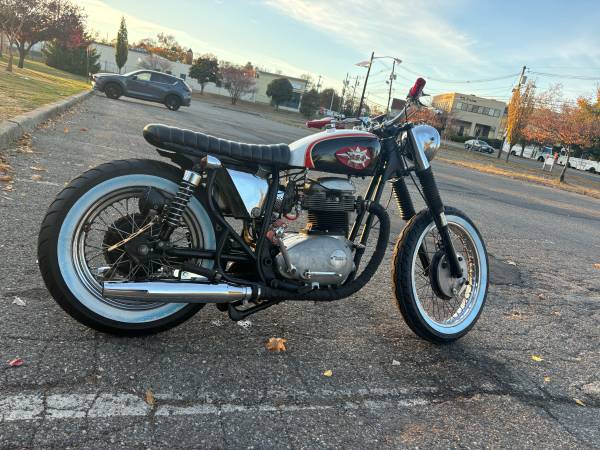 Brand new electrical system, new tailight and blinkers, new regulator, new rear shocks, carb rebuild, top AND bottom of engine have been completely rebuilt by Bobby at John’s motorcycle repair in Woodside Queens (the best BSA guy in the US), new custom paint, new HD chrome pipes, new wrapped headers, custom spiked engine mounts, original rebuilt headlamp basket with new wiring and new Lucas glass (hi and lobeam works!), new shock boots, chopped rear end (rear end shortened & welded), custom seat and mounting system, rebuilt shocks and brakes, brand new whitewall tires (still has blue protective enamel), new red grips and custom fabricated kickstart pedal, brand new battery, tuned up for the summer and ready to go!! Kickstart only. Splints are turnkey ready. Weeps oil like all 60’s British bikes but runs great. It’s very old but well cared for! It’s over 60 years old but looks like new and grunted to keep you smiling every minute you’re on it.