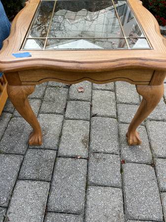 Oak, glass & brass end tables. $30 each