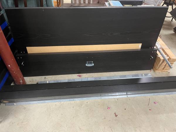Low rise queen size bedroom set-Malm black/brown. Comes with bed frame and headboard, 2 side stands, 1 sliding top storage cabinet for foot of bed, and supports for under mattress. Includes all required hardware and some assembly will be required. Cost would be over $525 if purchased new. The set is in almost new condition. Willing to entertain reasonable offers.