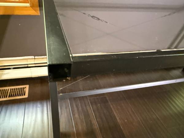 Modern metal desk with tempered glass 58 inches x 27 inches In very good condition. Missing two end caps as you can see in the photo.