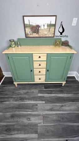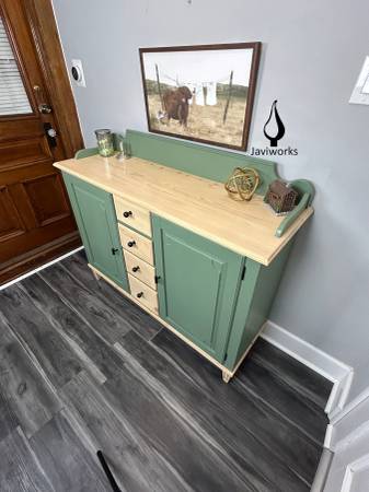 This is an Ethan Allen buffet. This item has been used and refurbished with a water based “cedar green” color paint (Benjamin Moore) and cottage cotton stain on the beautiful grain. It is solid wood and I believe it has pine solid wood. These buffets in great condition go for around $1000 - $2000. I want to sell it to someone at a more affordable price and that they can enjoy it