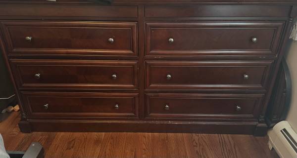 Dresser w/mirror, chest, two night stands. Dark brown, solid wood. Good cond. one dresser drawer may need a new track. Dresser is 70 inches wide, 37 inches high, 19 inches deep Chest is 43 inches...
