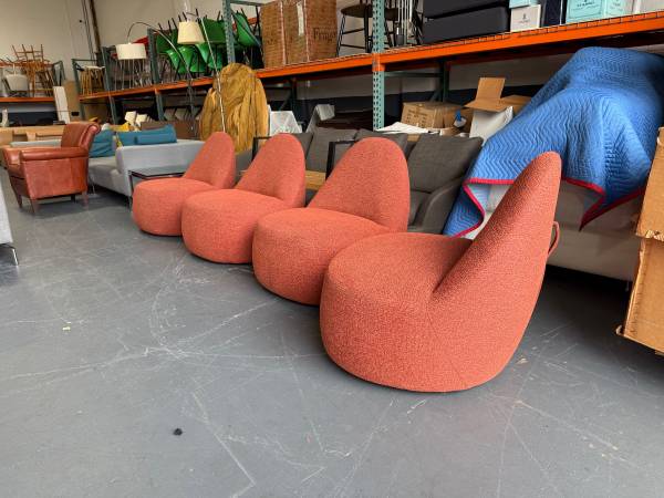 We have 4 of these designer Mitt lounge chairs, by Bernhardt. Very comfortable modern lounge seating. They sit on wheels. Once weight in placed on the chairs, the wheels don't roll anymore. Selling for $650 EA. Pick up from our warehouse in Saddle Brook, NJ. Please email me if you have any questions. Thank you.